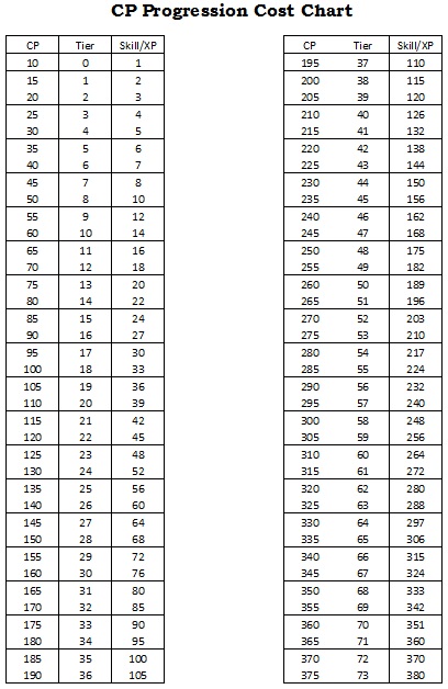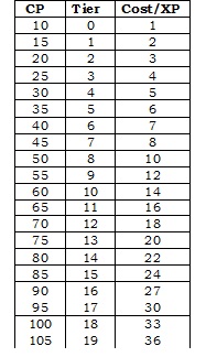 While all players gain 1 CP for every 4 XP, the amount of training it takes to gain 1 XP may vary among players based on their current level of experience. A single XP is made up of training points. Your current CP total is used to determine how many training points are required to equal 1 XP. As a new character with 10 CP, the cost in training points per XP is 1 for 1. This requirement increases as your character progresses. The costs for each XP during your first 105 CP are reflected in the chart below. Every 5 CP constitutes a new Tier which defines the new cost for XP in training points.