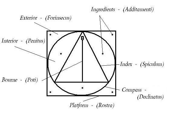 A triangle is the Index (Spiculum). The Index is the focal point or rather, used to direct the magics being used to the target. Usually Isosceles, the top of the Index is called the point and the bottom is the base whose ends are called corners. The Bourne is commonly placed within an Index.